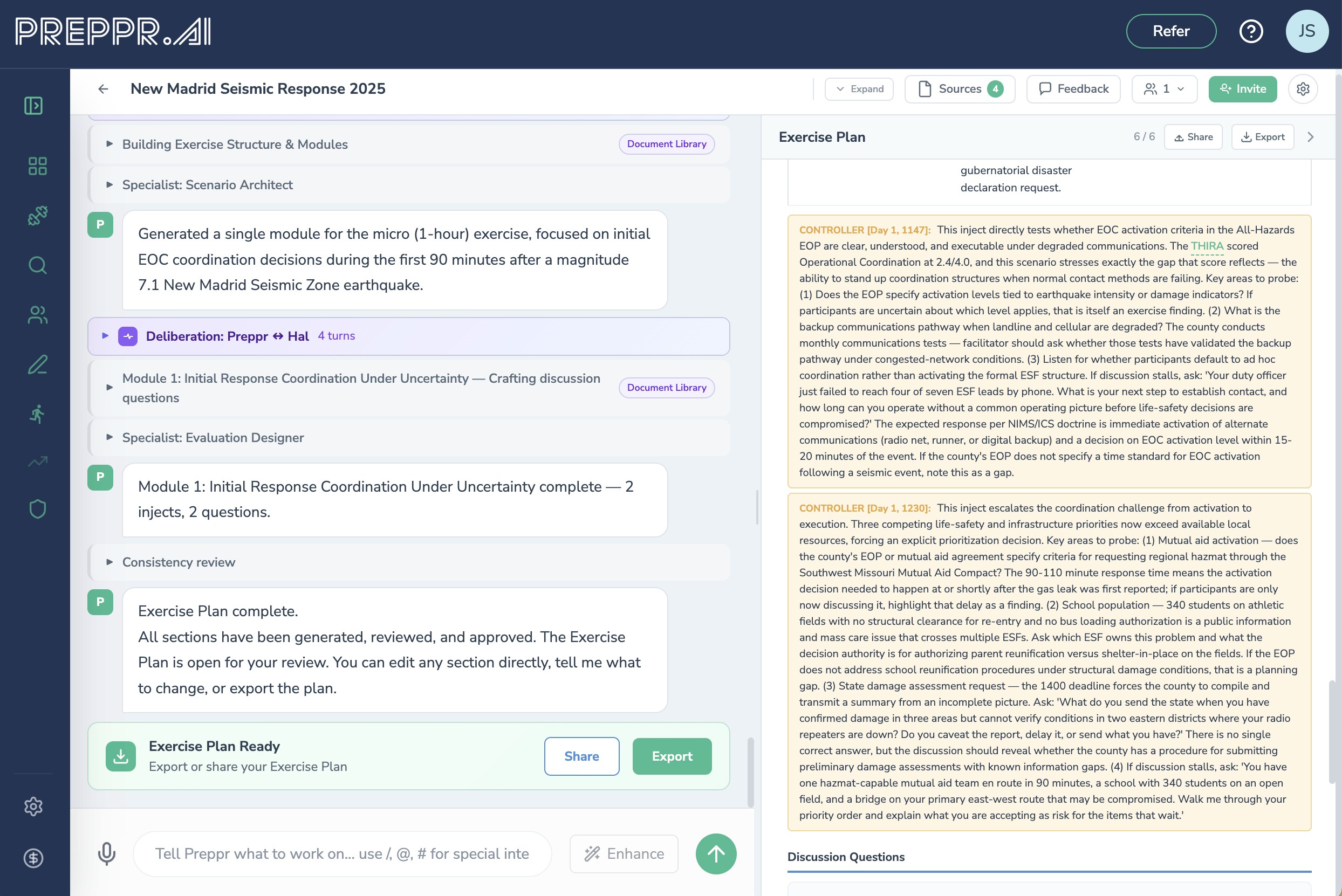 Preppr also tracks document intelligence during discussions. When uploaded plans are available, the system identifies gaps between what participants say they would do and what their documented procedures actually specify — providing the kind of evidence-based findings ("Group stated they would use phone calls to request mutual aid, unaware that the Regional Mutual Aid Agreement Section 2.3 requires WebEOC-based requests with 4-hour response commitments") that practitioners normally reconstruct hours after the exercise ends.
