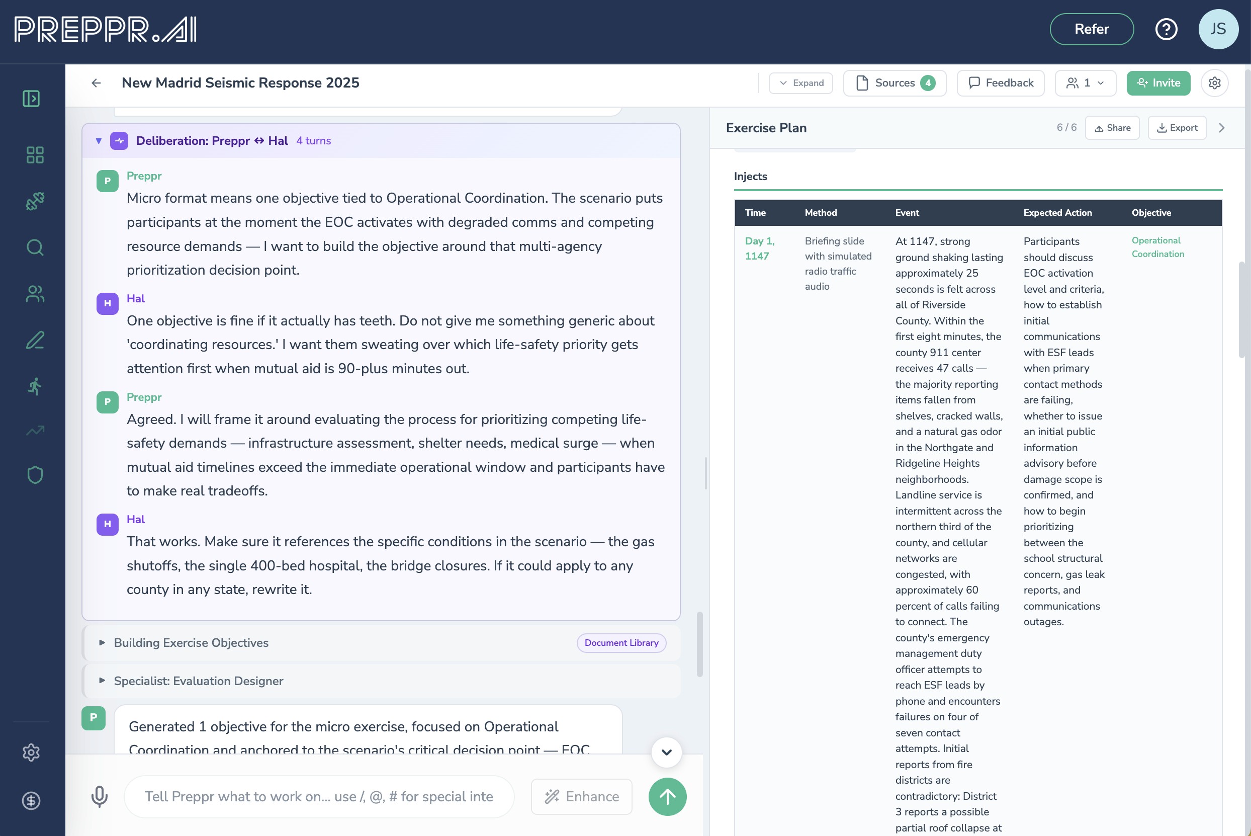 More broadly, Preppr structures every exercise around HSEEP-aligned objectives, functional groups, and capability frameworks from the start. The inject sequence is built to force evaluable decisions — not just discussion topics. Because the design layer is built for documentation, the evaluation structure is already in place before the first participant logs in.