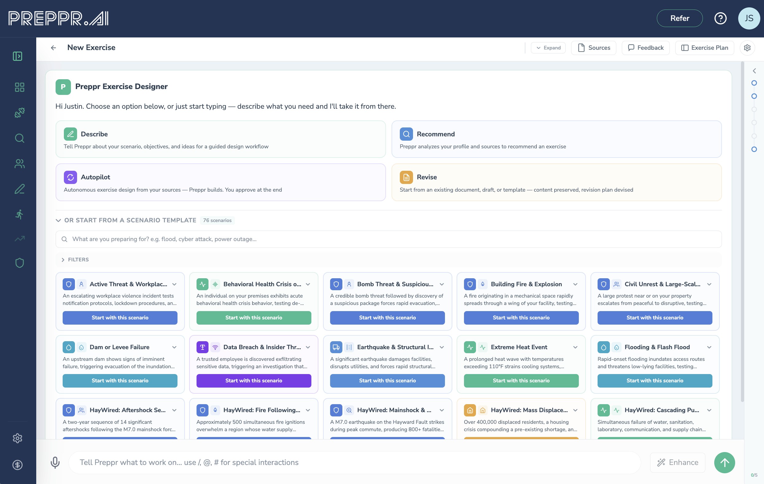 The platform offers four design entry modes — Describe, Recommend, Autopilot, and Revise — so you can generate a complete exercise framework in minutes rather than days, starting from whatever level of detail you have. A library of 76+ scenario starter cards grounded in real incidents gives planners a defensible, doctrine-aligned foundation rather than a blank page.