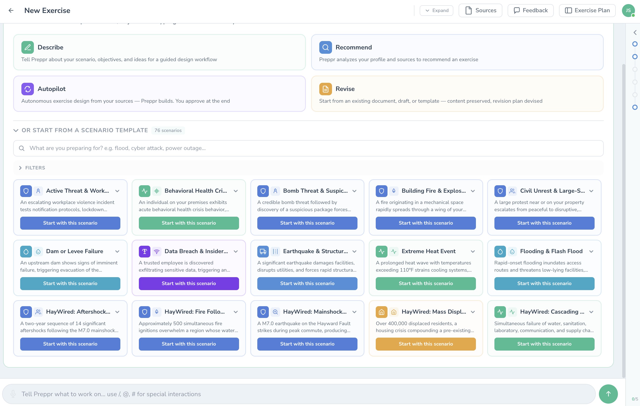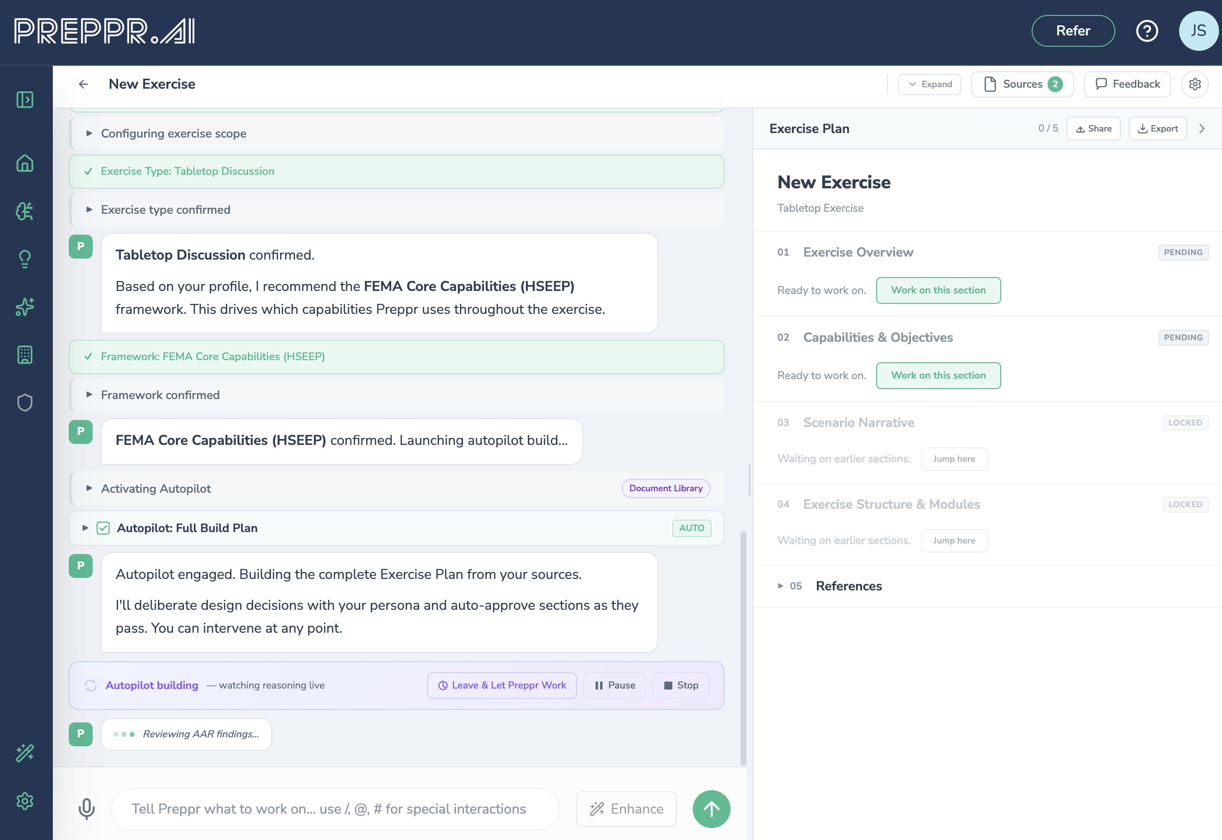 Preppr Exercise Designer guides you through a structured, HSEEP-aligned workflow — grounded in your plans, your capabilities, and real threat intelligence. From scenario to MSEL, every step is conversational, connected, and built to compound.