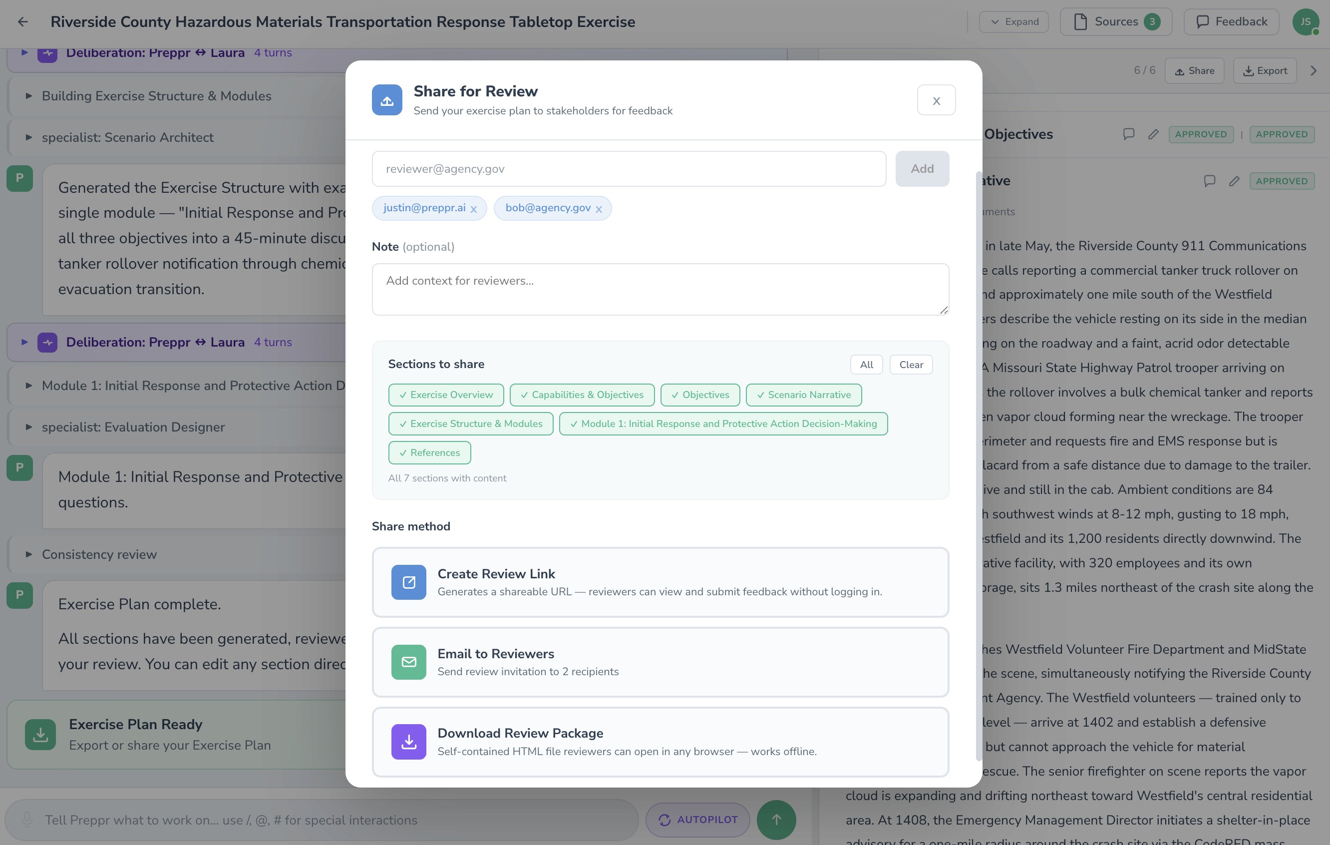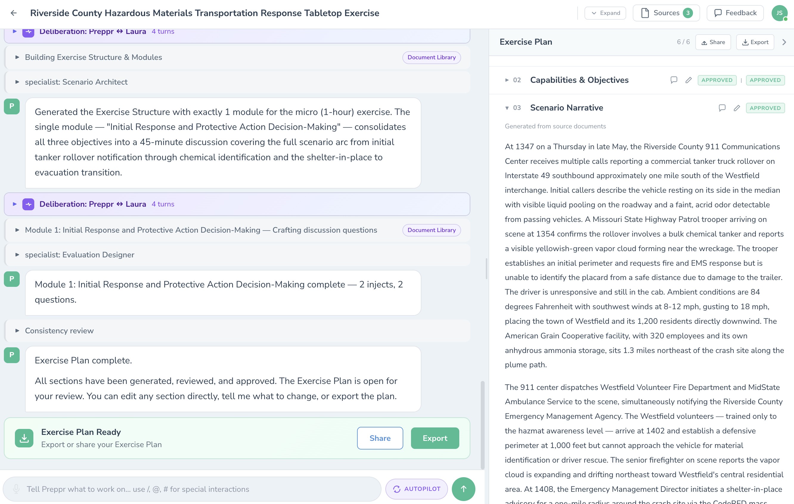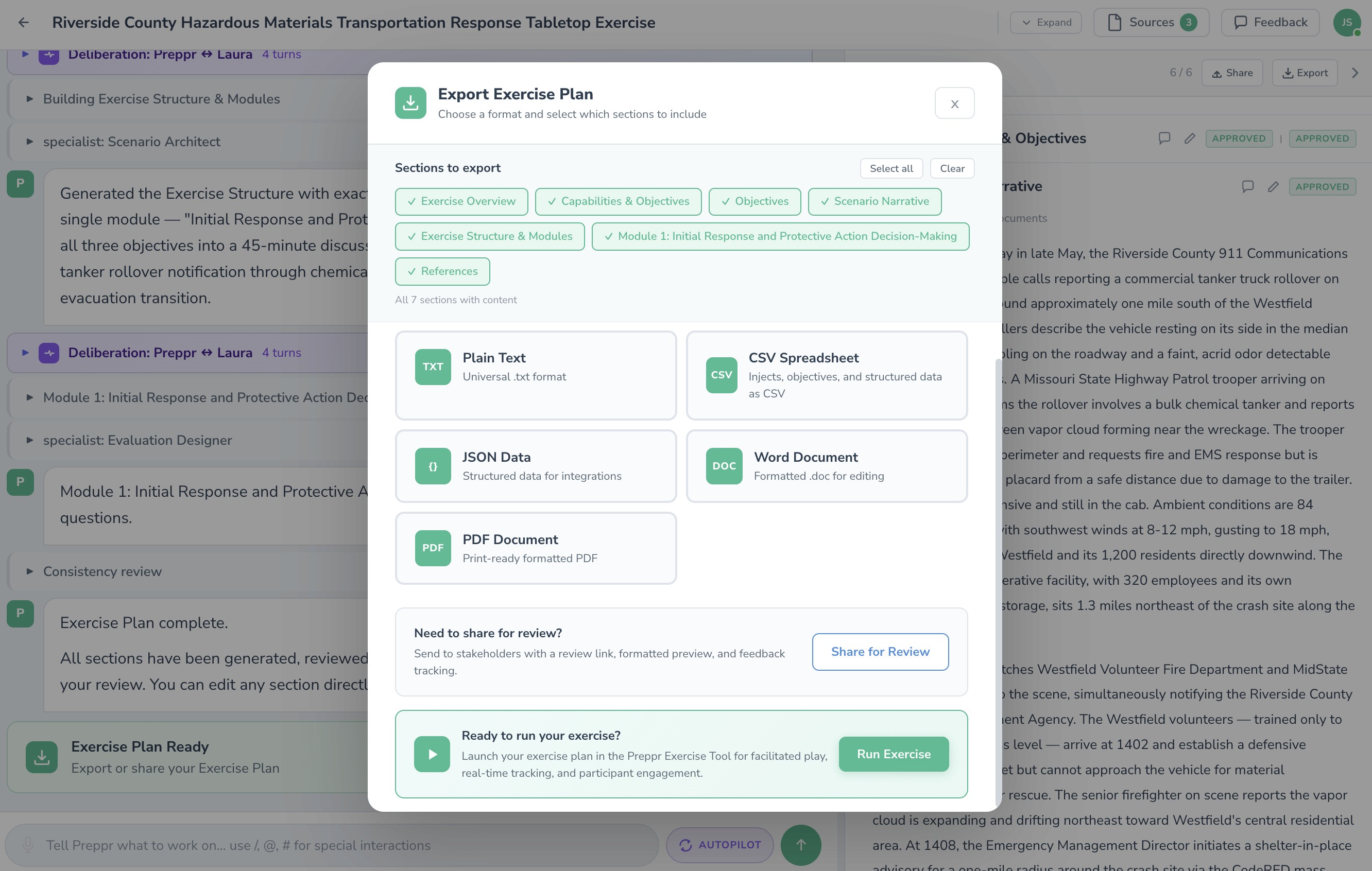 Preppr walks you through every element of exercise design — document and plan integration, capability selection, objectives, scenario development, injects, discussion questions, and MSEL. Structured AI guidance at every step. No exercise design expertise required.