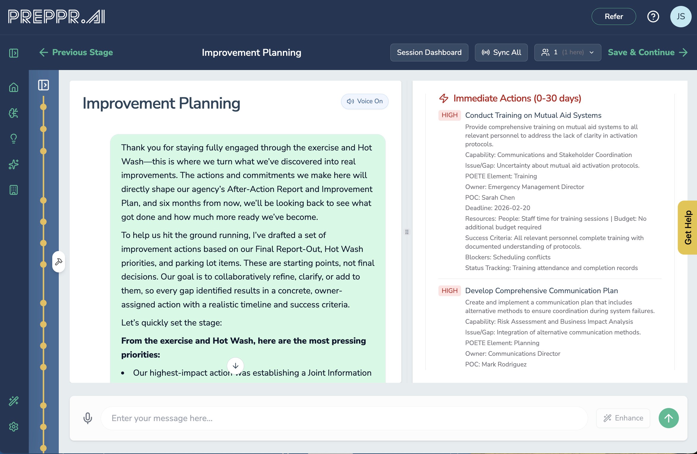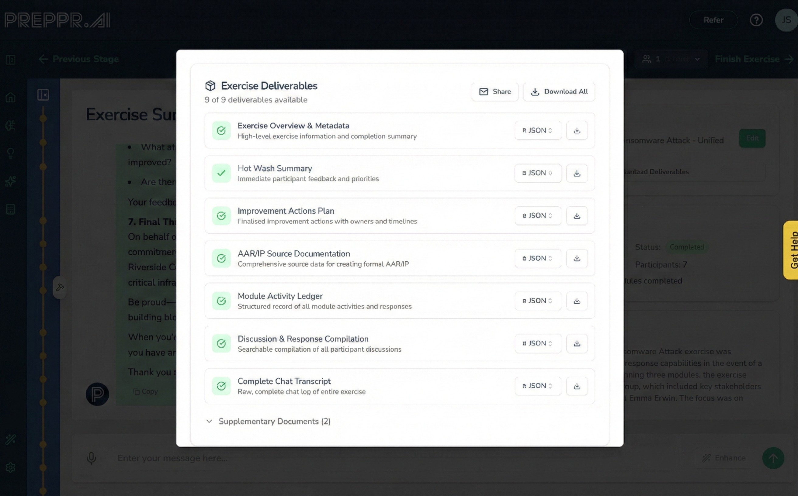 Preppr generates facilitator-ready exercise documentation and linked source data — organizing hotwash outputs, improvement actions, and discussion records into structured inputs for After-Action Reports and Improvement Plans. All findings remain traceable to their original discussions.