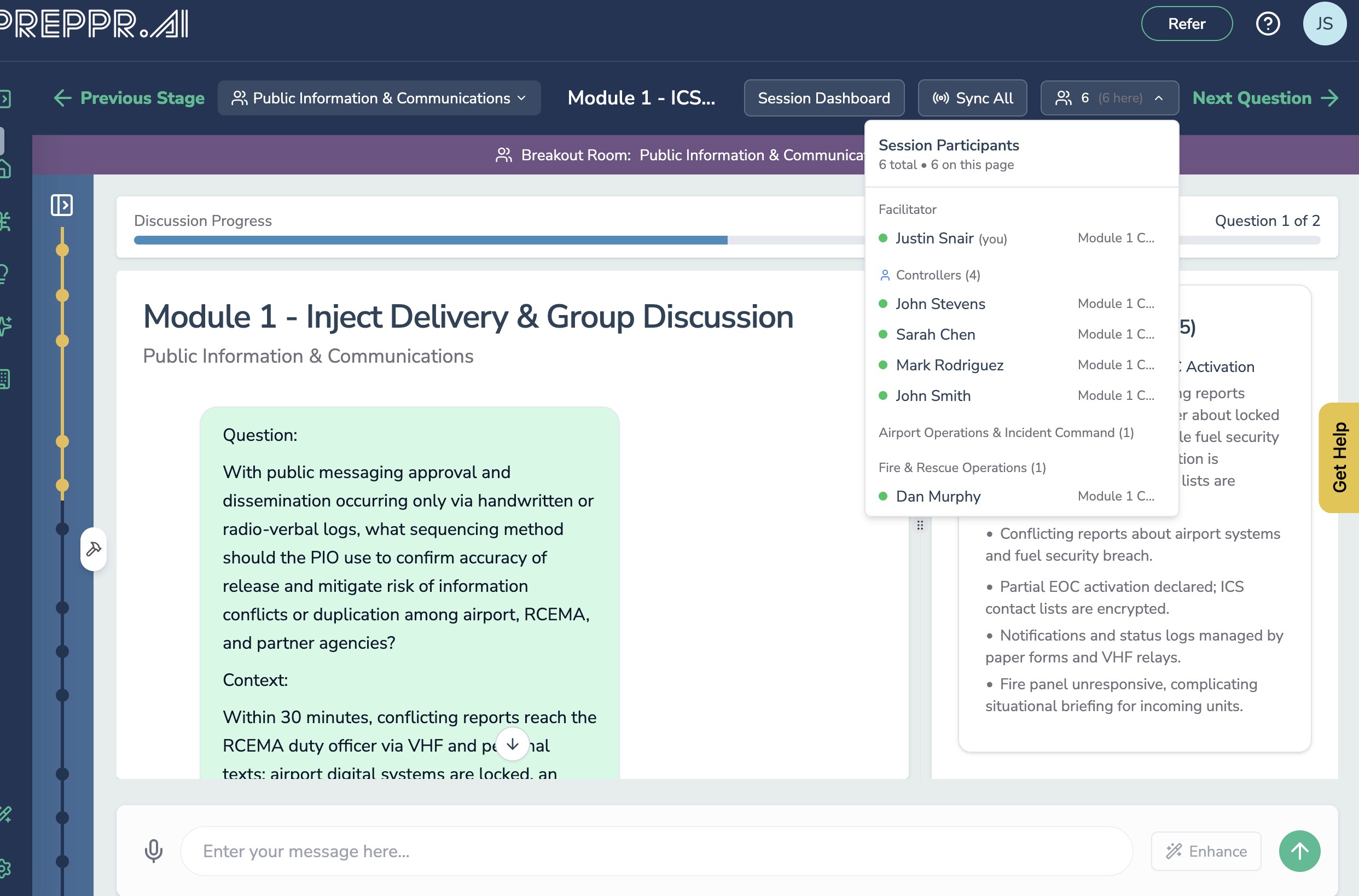 Teams work through realistic injects that increase in complexity, revealing consequences of earlier decisions and building sophisticated response strategies—just like real emergencies evolve.