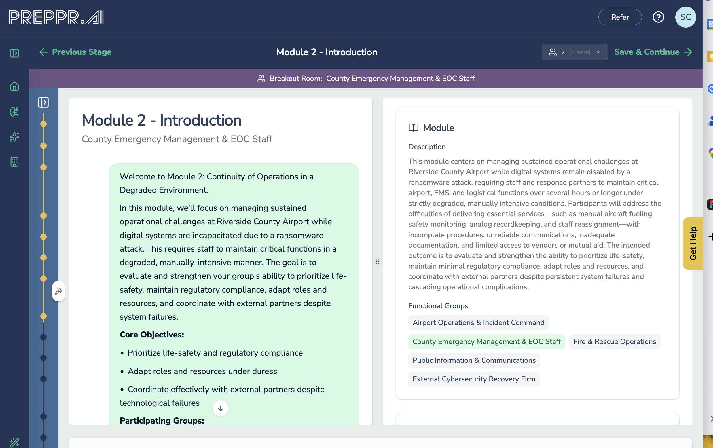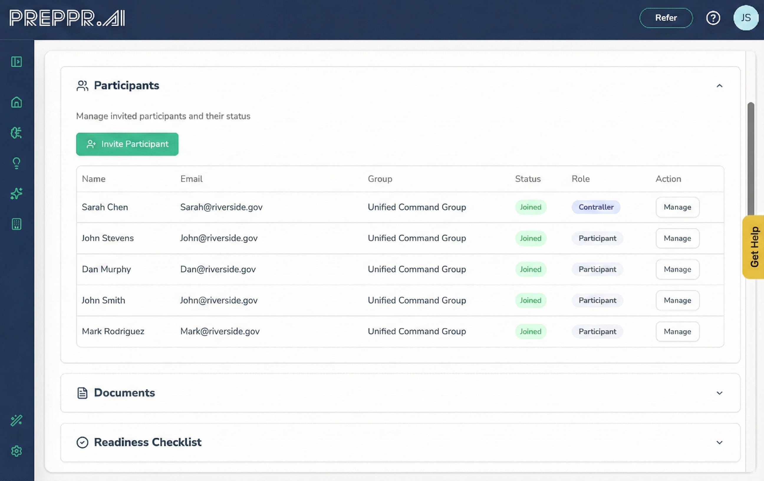 Preppr Exercise supports multi-role coordination, with facilitators managing overall flow, controllers running functional group breakouts, participants focused on discussion, and evaluators observing and documenting