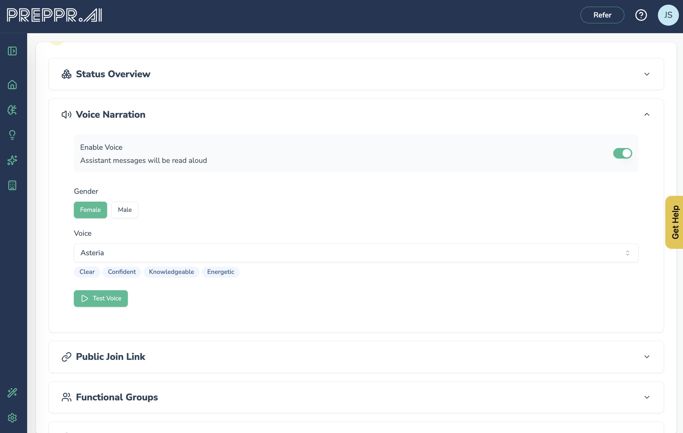 Preppr Exercise uses configurable voice narration to read prompts aloud, summarize discussion, and guide participants through exercises — helping facilitators maintain flow and focus without added effort.