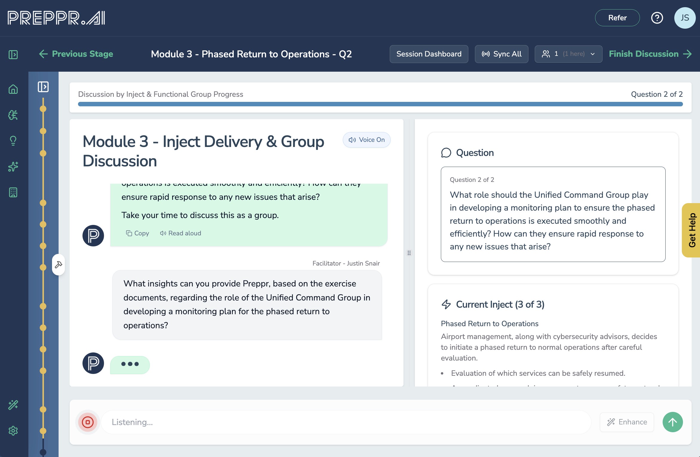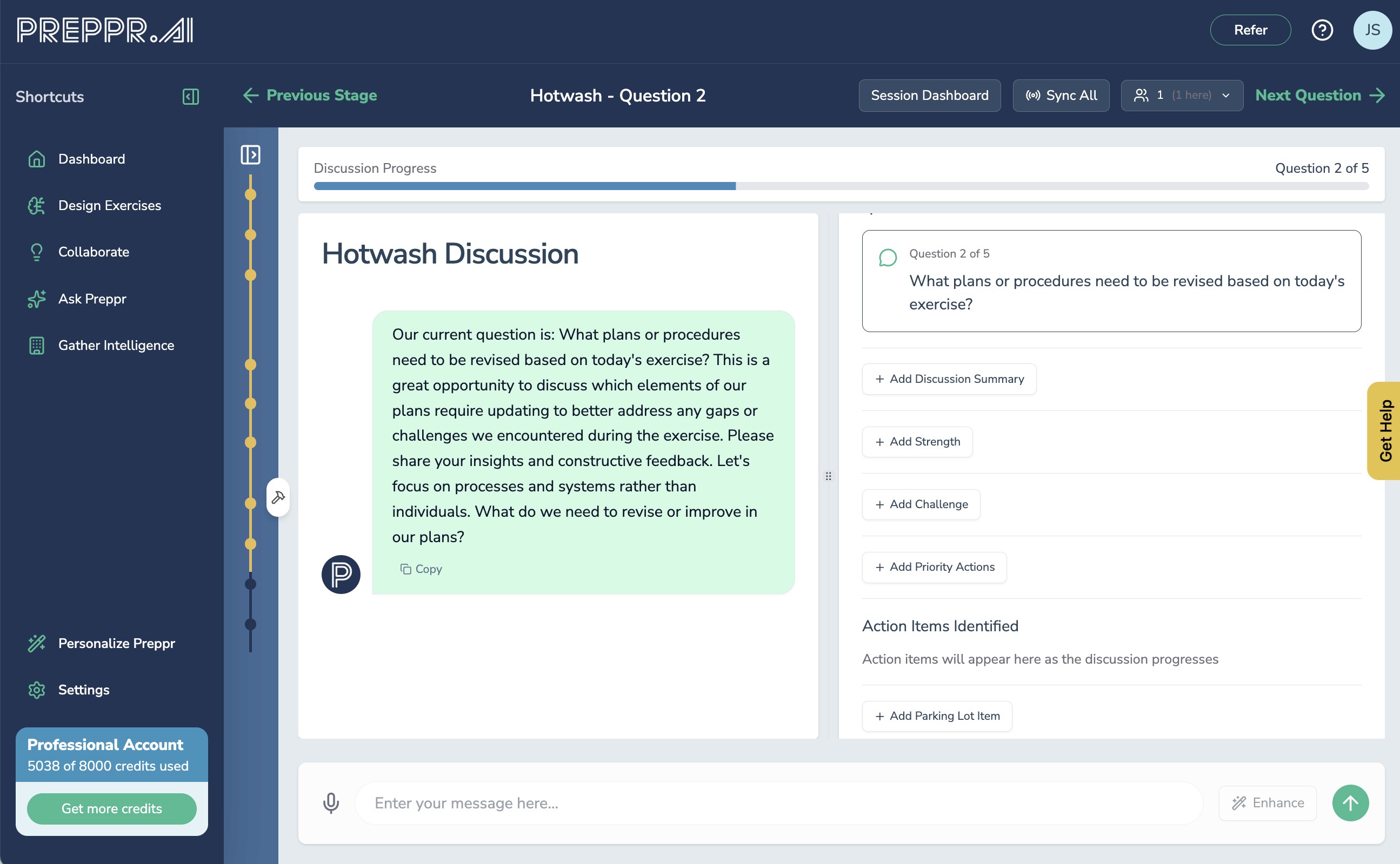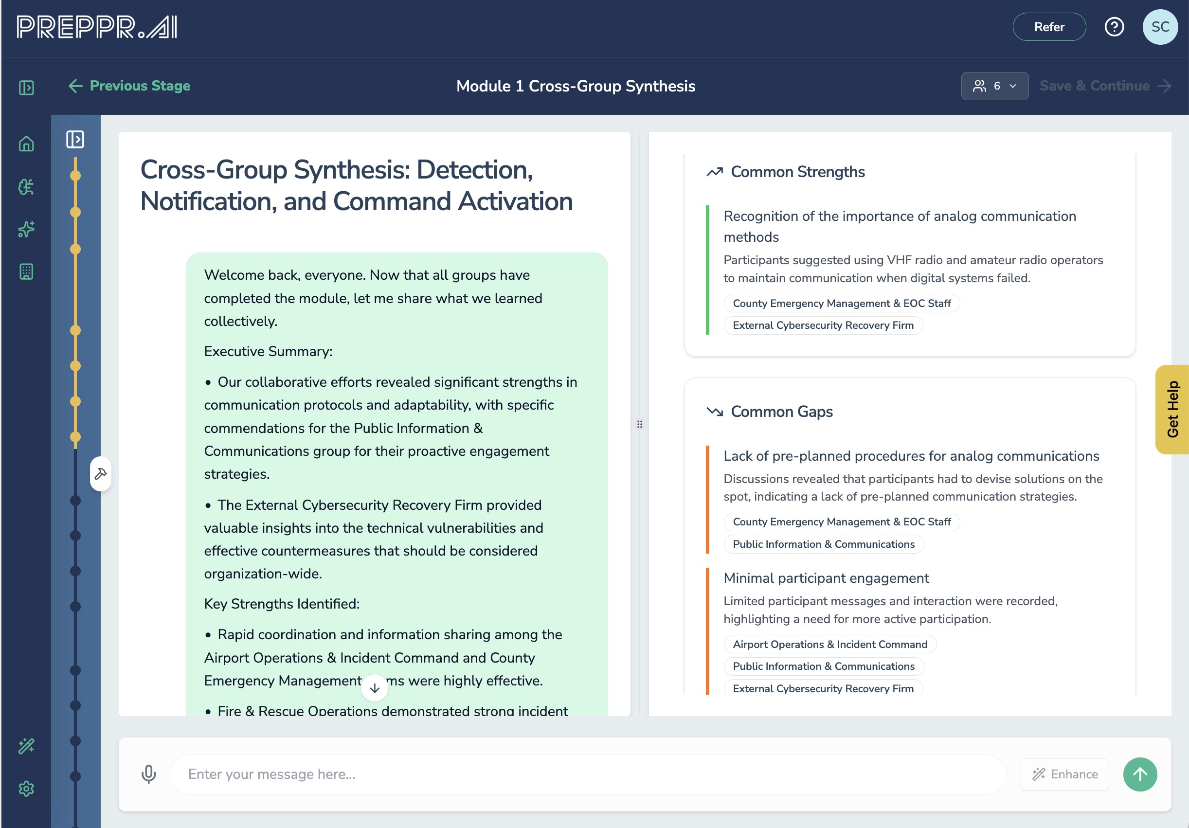 Run the hotwash immediately while discussions are fresh. Preppr captures and synthesizes group input live, surfaces themes and gaps, and helps facilitators guide insight across functional groups — without waiting on post-exercise surveys or manual follow-up.