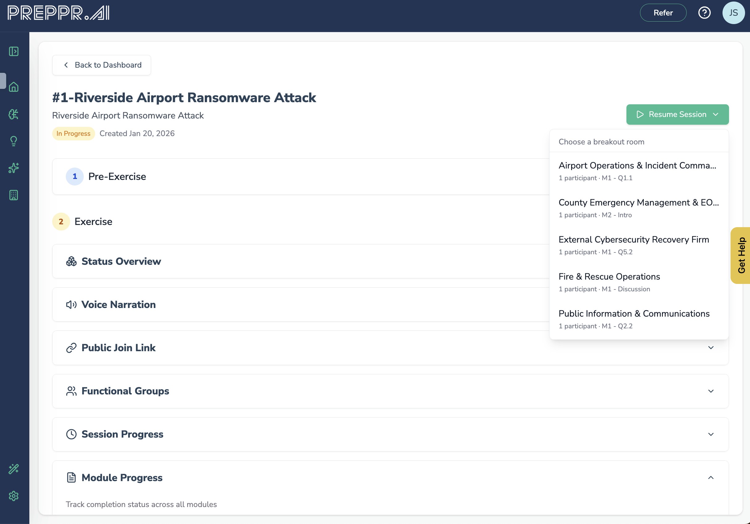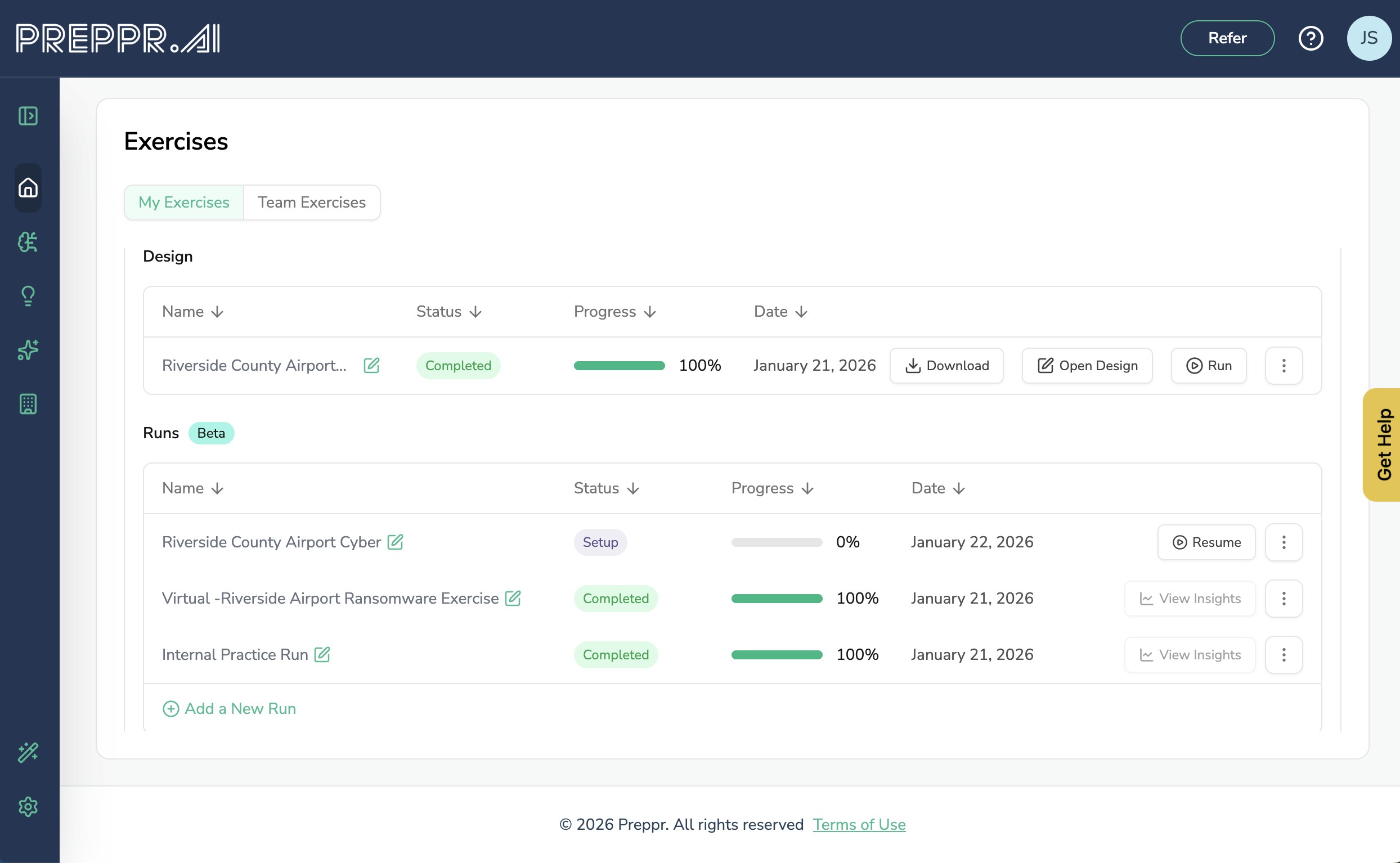 Preppr Exercise makes it easier to execute complex exercises while capturing what matters as the exercise unfolds. Teams can run exercises built in Preppr or their own materials, support multiple runs, and surface insights in real time — without adding overhead during delivery.